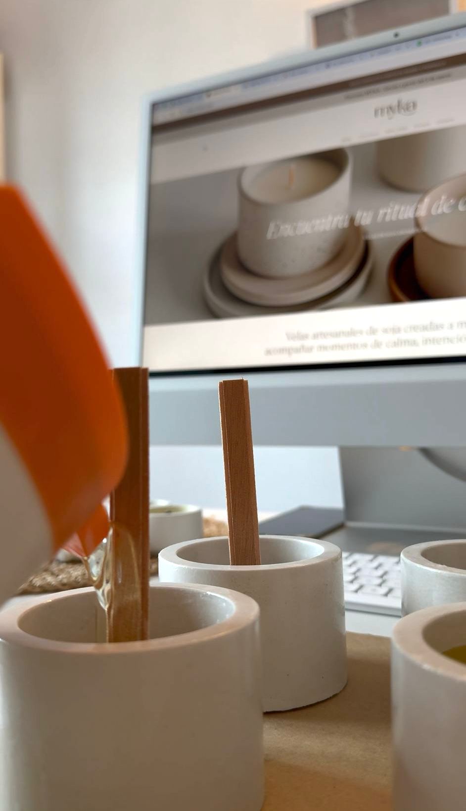 Cada recipiente de cemento y cada vela se elaboran a mano, respetando tiempos de curado y acabado.
